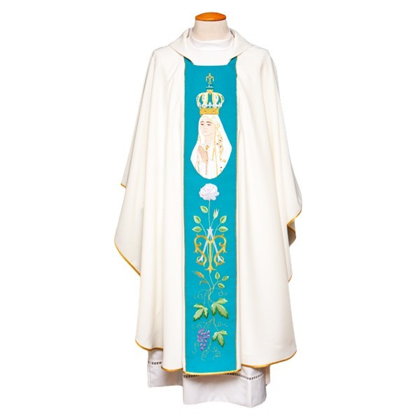White Marian Priest Chasuble with a blue Stole. Coloured embroidery on the stole.