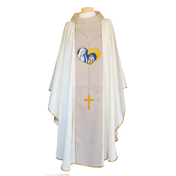 Off-white Marian Priest Chasuble with a a beautifully done coloured embroidery image of the Fatima Apparitions, a golden Rosary and a golden Crioss on dark coloured stole.